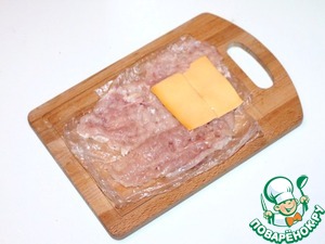 Выложить на куриное филе пластину сыра и скрутить в рулон.