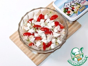 8. Сыр фета нарезаем кубиками и добавляем к салату.