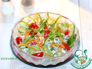10. Заправляем салат и убираем в холодильник, минут на 30. Затем руками рвем листья зеленого салата и добавляем в салат, аккуратно перемешиваем и подаем к столу.