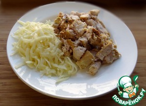 Мясо нарезать кубиками, сыр натереть на крупной терке.
