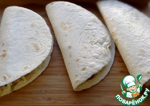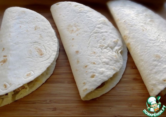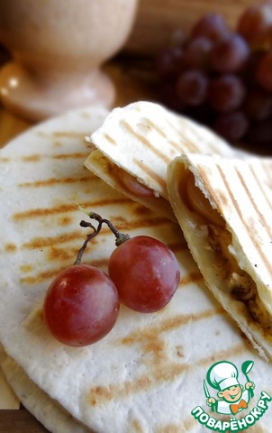 Кулинарной кистью нанести на тортилью тонкий слой горчицы. На одну половину лепешки выложить треть филе, винограда и сыра.