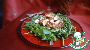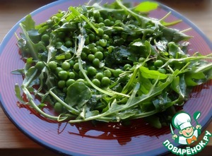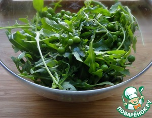Смешать рукколу и горошек с заправкой и выложить на тарелку.