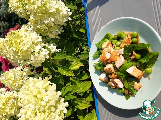 Прекрасное сочетание орехового вкуса рукколы, сладости зеленого горошка и нежной приправленной курицы.