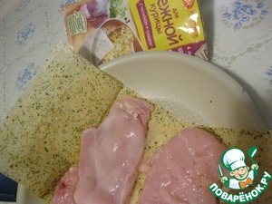 • 1. Куриное филе отбить, обжарить на сухой сковороде, завернув в листы от Магги.