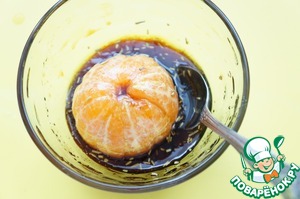 • 2. Смешать соевый соус, мёд, сухой или свежий розмарин (половину) и оливковое масло. Мандарины очистить, обмакнуть каждый плод в полученный соус.