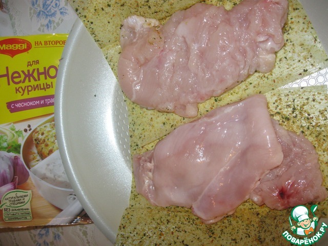 Куриное филе слегка отбить, завернуть в листы для жарки от Магги "Для нежной курицы с чесноком и травами". Обжарить с каждой стороне по 5-7 минут на сухой сковороде без масла. |