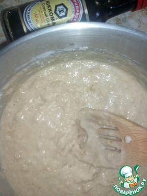 Яично-соево-молочную смесь налить в смесь мучную и перемешать. Тесто получается густое. С ложки не стекает.