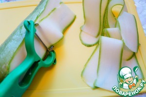 Пока грудка готовится, один средний или два маленьких молодых кабачка помыть, нарезать на тонкие полоски при помощи ножа для чистки овощей.