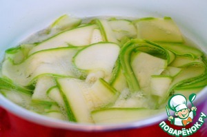 Выложить нарезанные кабачки в кипящую соленую воду. Подержать их на небольшом огне две минуты пару раз перемешав. Откинуть в дуршлаг и быстро промыть холодной водой.