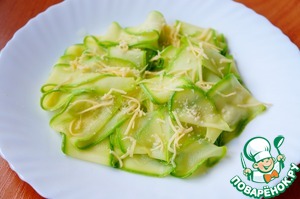 Собрать блюдо: на тарелку выложить часть пасты из кабачков, сбрызнуть лимонным соком, посыпать измельченным миндалем и тёртым сыром. Сверху еще один слой кабачков, снова лимонным соком, миндалем и сыром. Полить оливковым маслом.