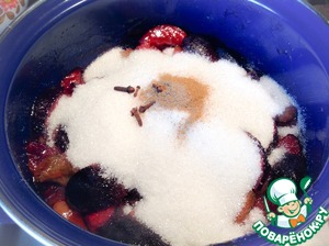 В кастрюлю выложить сливы. 2 ст. л. сахара смешать с половиной пачки Желфикса (20 грамм), добавить к сливам и хорошо перемешать. Ни в коем случае весь сахар сразу не высыпать.