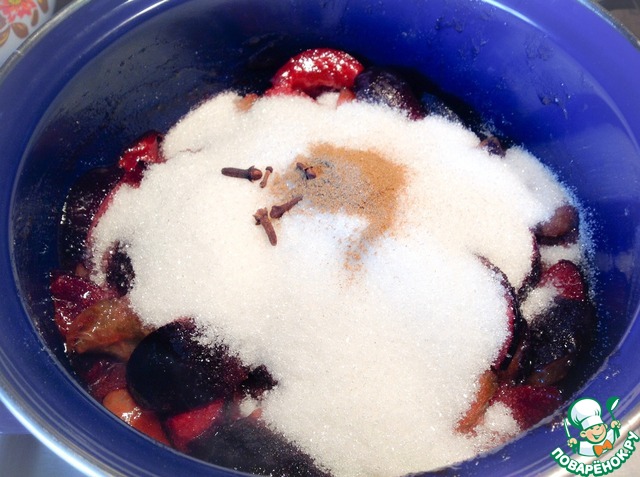 Кастрюлю поставить на огонь и довести до кипения, постоянно помешивая. Добавить оставшийся сахар, корицу и гвоздику.
