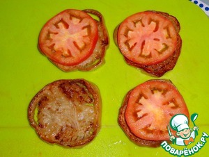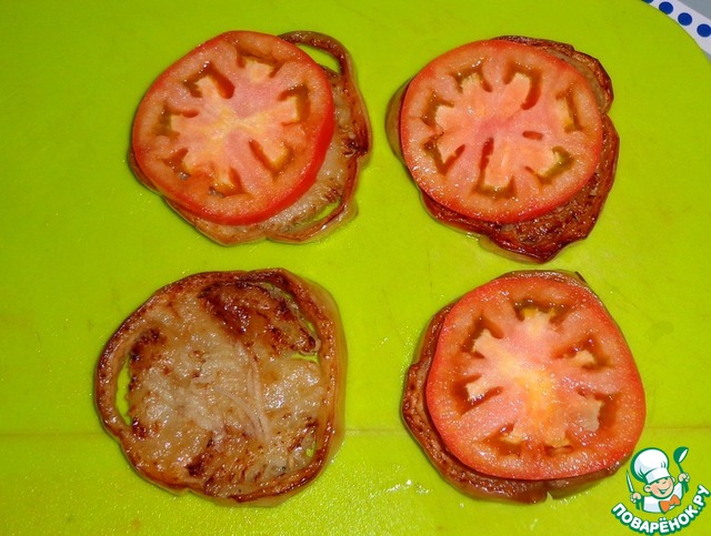 Помидор порезать кружочками. Начинаем собирать закуску. На баклажан положить чеснок, затем помидор.