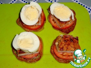 Положить мясо и яйцо, порезанное кружочками.