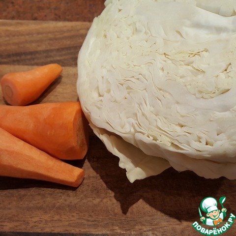 Существует много приспособлений для шинковки капусты. Мне нравится рубить капусту широким ножом типа "топорик", можно воспользоваться специальной доской для шинкования или овощечисткой. Если Вы будете шинковать капусту ножом, разрежьте кочан на 2 или 4 части в зависимости от размера, не удаляйте кочерыжку, чтобы листы капусты не рассыпались. У меня кочан весом около 2 кг. Я разрезала на пополам. Одной рукой прижимаю капусту к доске, а другой рублю.