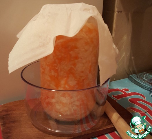 Накрываем банку чистой салфеткой и ставим в теплое место. Через пару дней можно начинать пробовать капусту. При достижении капустой желаемой степени закваски, закрываем банку плотно крышкой и переставляем её в холодильник. В холодильнике капустка будет потихоньку доходить и набирать ядрённости, но надолго она обычно не задерживается.