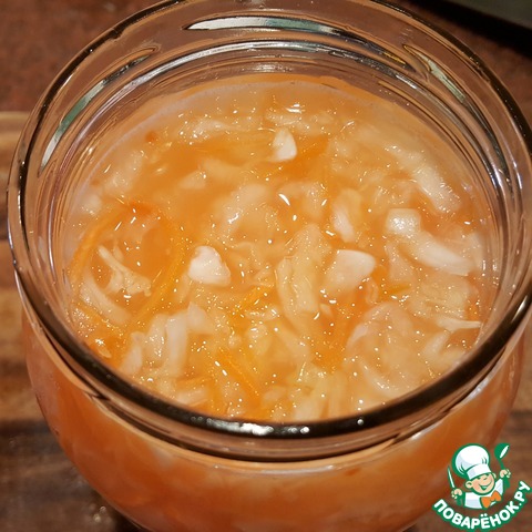 Банки: На мой взгляд самые удобные для такой капусты банки объёмом 1л. Банка должна быть чистой. Можно заквасить капусту в 3х литровой банке, но подумайте, будет ли в Вашем холодильнике столько свободного места через пару дней. И каждый раз доставать/убирать 3х литровую баночку немного сложнее, чем литровую. А так, дело хозяйское. Итак, указанное количество ингредиентов как раз плотненько утрамбовалось в одну литровую баночку. Сверху сразу выделился сок. При более сухой капусте сока может быть изначально чуть меньше. Не переживайте, просто плотно утрамбуйте капусту с морковью в банку.