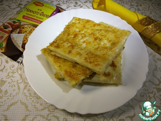 Каждый конверт окунуть во взбитое яйцо и обвалять в сухарях. Обжарить по 2-3 минуты с каждой стороны до золотистой корочки.