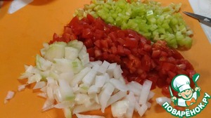 Перец, помидоры и лук мелко режем, примерно размером с кукурузные зерна (чтобы салат получился однородным)