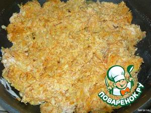 • Трем морковь, тонко режем лук, обжариваем до готовности. Затем добавляем мелко порезанный чеснок