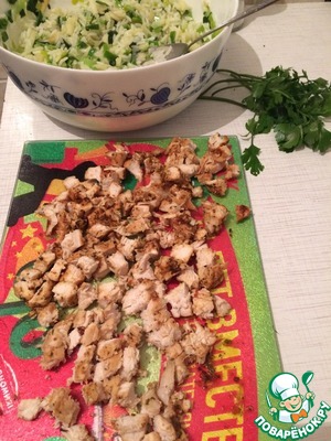 Куриное филе обжарить на сковороде без масла, завернув кусочки мяса в листы для жарки Магги