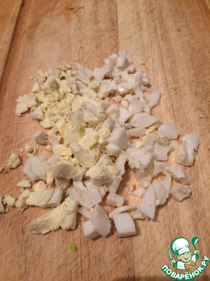 Готовый салат выложите в салатник, украсьте ломтиками яйца и зеленью петрушки.