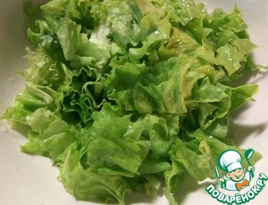 Тем временем листья салат вымыть, дать стечь воде и порвать руками. Выложить листья в глубокий салатник.