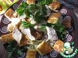 Теперь собираем салат, - на основу из капусты и лука выкладываем кусочки сырного блинчика, грудки, польем оставшимся соком от жарки мяса, красим зеленью и подаем!