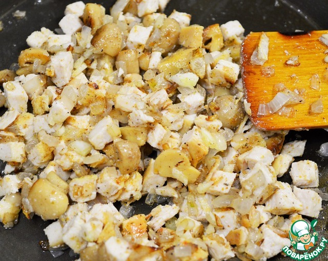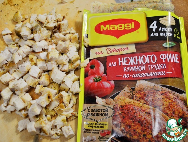 Филе куриной грудки обжарить на листе Maggi, нарезать мелкими кусочками.