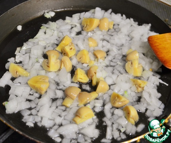 Лук мелко нарезать, обжарить. Добавить к луку порезанные шампиньоны и измельчённый чеснок.