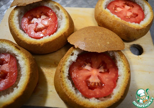 На помидор выложить начинку. Сверху положить натёртый на крупной тёрке сыр.