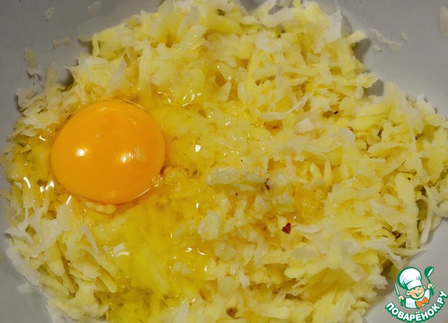 Натираем картофель на крупной тёрке, хорошенько промываем и отжимаем. Добавляем яйцо, чеснок, соль. Перемешиваем. Картофель даст сок, его тоже надо слить.