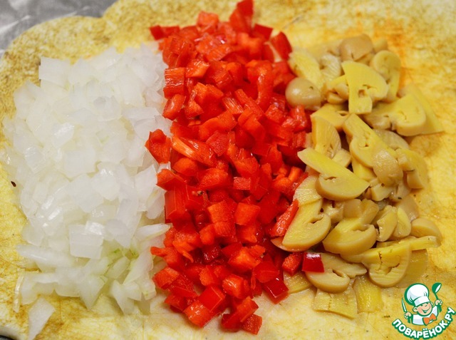 Мелко нарезаем лук, перец и шампиньоны; обжариваем на растительном масле.