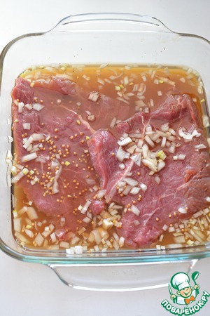 Яблочный сок нагрейте до кипения с мелконарезанным луком и семенами горчицы, добавьте соус "Терияки" Киккоман. Попробуйте маринад на соль, при необходимости посолите.