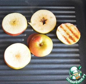 Яблоки нарежьте кружочками по 0,5 см толщиной. Также смажьте маслом и готовьте на гриле с двух сторон до появления характерных полосок