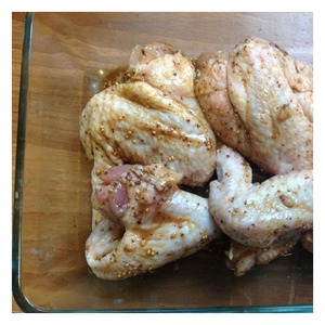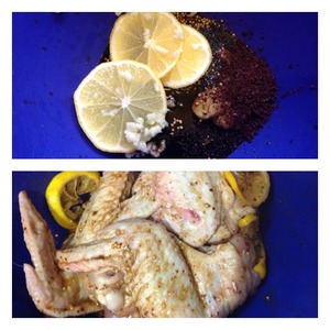 Выкладываем дольки лимона, сумах и чеснок пропущенный через пресс. Маринад перемешиваем и выкладываем наши крылышки. Тщательно обмазываем маринадом, чуть "жулькая" руками. Оставляем курочку минимум на час для маринования.