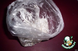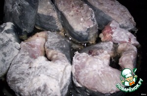 Кусочки сома обвалять в муке (насыпать муку в пакет).