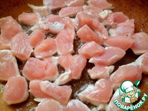 Одновременно будем готовить стир-фрай. Нарезать куриное филе кусочками, хорошо разогреть сковороду с маслом и разложить его в один слой (это важно), чтоб мясо жарилось, а не парилось. Жарить по 1 минуте с каждой стороны. Если не помещается, сделайте второй заход. Быстро обжариваем, все время перемешивая, до готовности. Готовое мясо переложить в другую посуду и накрыть, чтоб сохранилось тепло. -