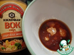 Приготовить соус для заливки стир-фрай. Смешать соевый соус "Вок" для жарки "ТМ Киккоман" с сахаром, солью, уксусом, водой, натертым имбирем, острым перцем и крахмалом.