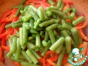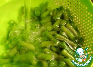 Закипятить воду для варки фасоли, подсолить. Отварить фасоль до полуготовности в сильно кипящей воде (у меня фасоль замороженная). Отцедить на дуршлаг и промыть под струей холодной воды. Дать воде стечь.