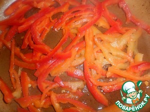 Перец взять красного цвета для красоты блюда, нарезать соломкой и обжарить в разогретой с маслом сковороде на сильном огне, постоянно перемешивая его.
