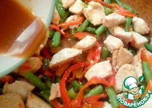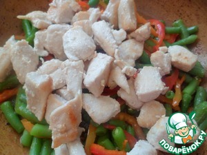 Вернуть к овощам куриное мясо, перемешать. Все делаем быстро.