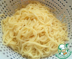 Во процессе приготовления овощей откинуть готовую лапшу на дуршлаг, добавить столовую ложку масла без запаха и перемешать.