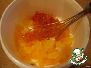 В другую часть крема добавляем апельсиновый джем + очищенный и нарезанный мелко, без плёнки, апельсин + оставшийся желатин.