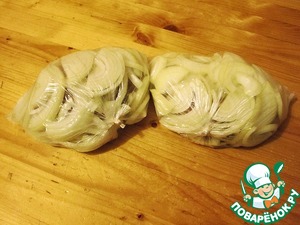 Ну вот, время прошло, пора собирать блюдо для приготовления. Берете обычный полиэтиленовый пакет пищевой, убедитесь что он 100 градусов держит и вредные вещества не выделяет, на упаковке написано. Если нет безвредного, то банально берете рукав для запекания. Они 100% рассчитаны на высокую температуру. У меня пакетики есть. Выстилаете луком подложку для мяса, лука не жалейте.