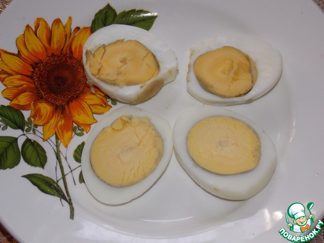 • Яйца разрезать. Слегка посолить.