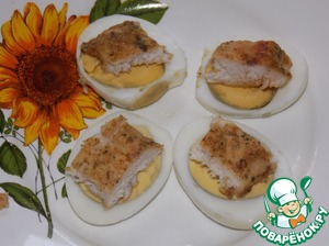 • Куриное филе нарезать на кусочки и выложить на яйца.