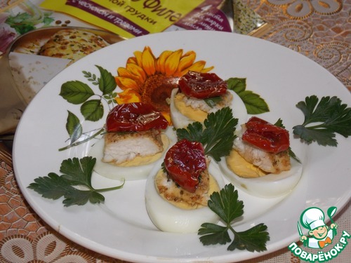 • На филе выложить листик петрушки и вяленые томаты.