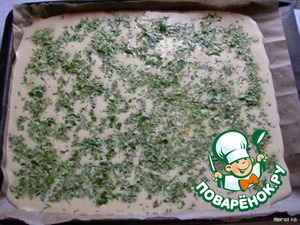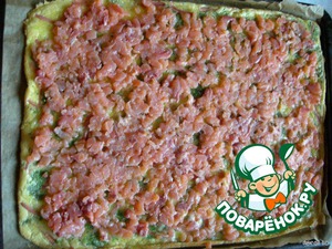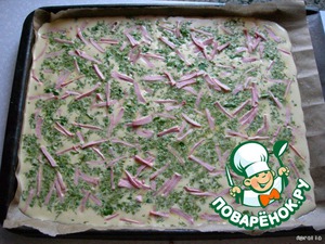 Взбиваем яйца с мукой, крахмалом и специями. Выливаем на противень, застеленный пекарской бумагой
