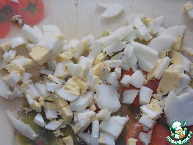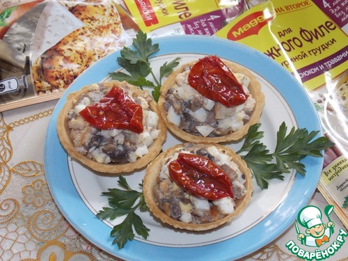 Вкусный и быстрый салатик получается по этому рецепту. Рекомендую его подать в тарталетках и украсить вялеными томатами. Очень вкусно.